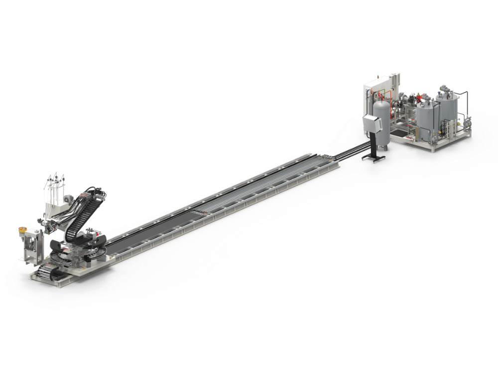 긴 사출 성형 시스템에서는 먼저 긴 유리 섬유(로빙)가 커터로 공급됩니다. 그런 다음 유리 섬유를 모노 필라멘트 가닥으로 불어넣고 유리 섬유를 제거하여 믹싱 헤드에서 즉시 PU를 함침합니다. PU가 혼합된 후 로봇이 섬유로 채워진 PU를 금형으로 이동시켜 반응 및 경화시켜 고품질의 내구성 있는 부품을 만듭니다. 이 방식은 최소한의 섬유를 사용하여 효율적인 혼합을 보장한다는 점에서 혁신적입니다.