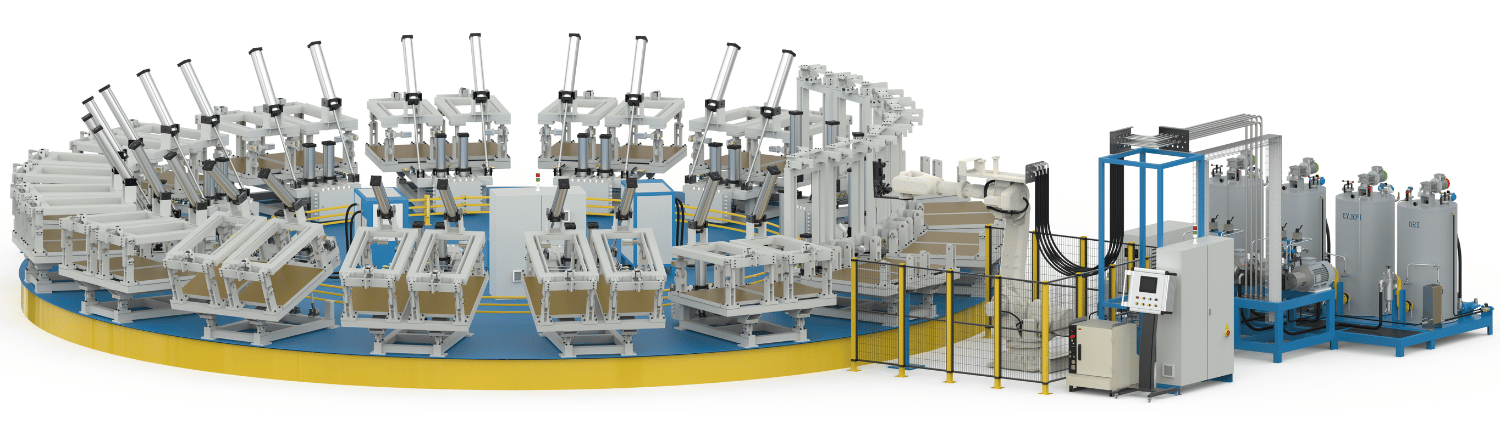 Includes a polyurethane foaming machine, mold carrier/cassette, industrial robot, and mold temperature unit, all designed for reliable and long-term performance in demanding production environments.